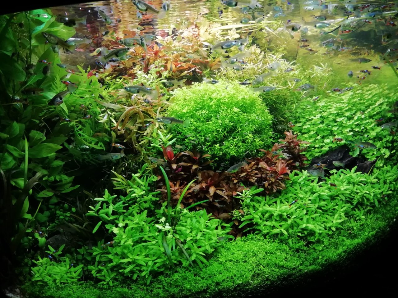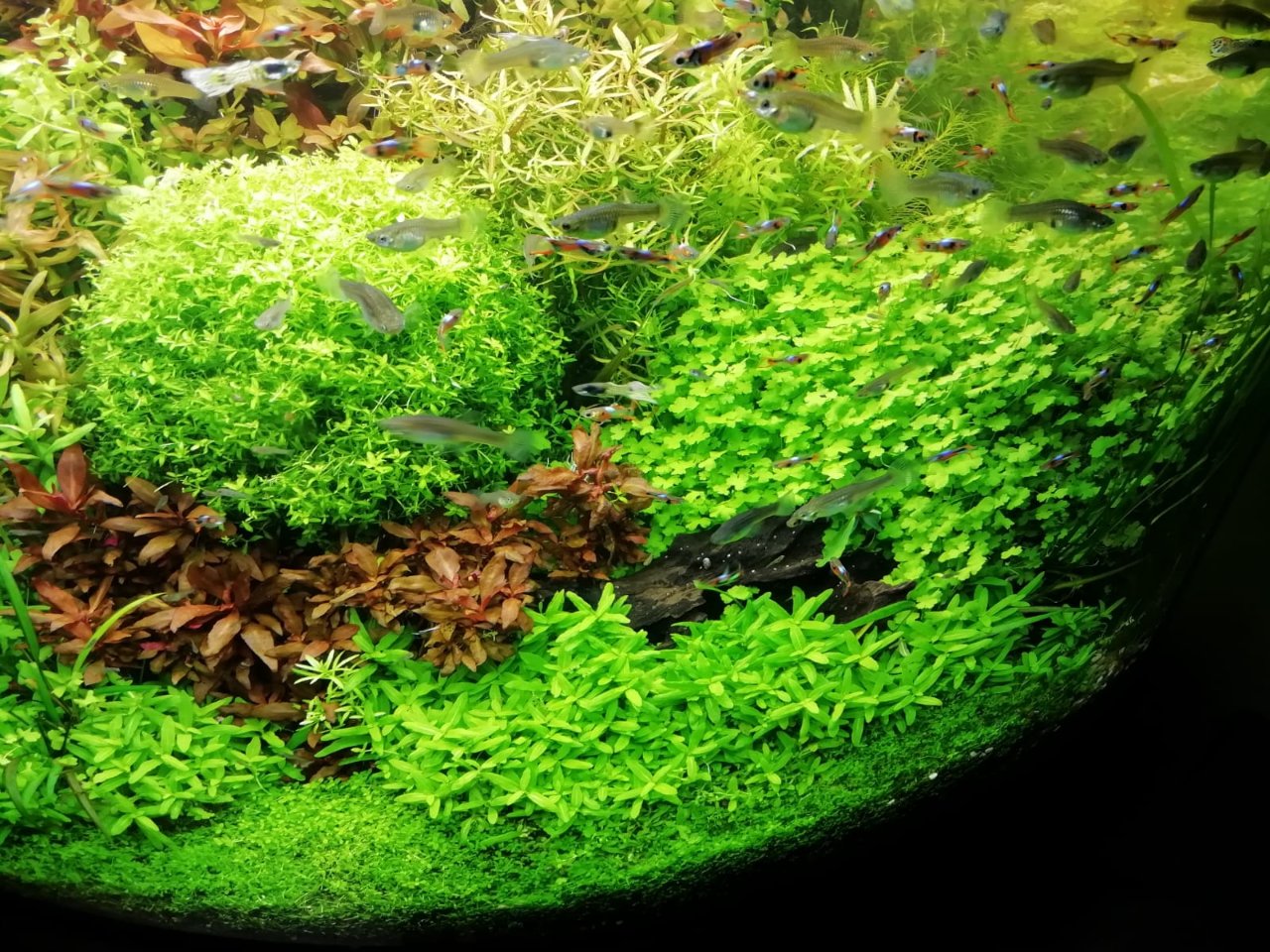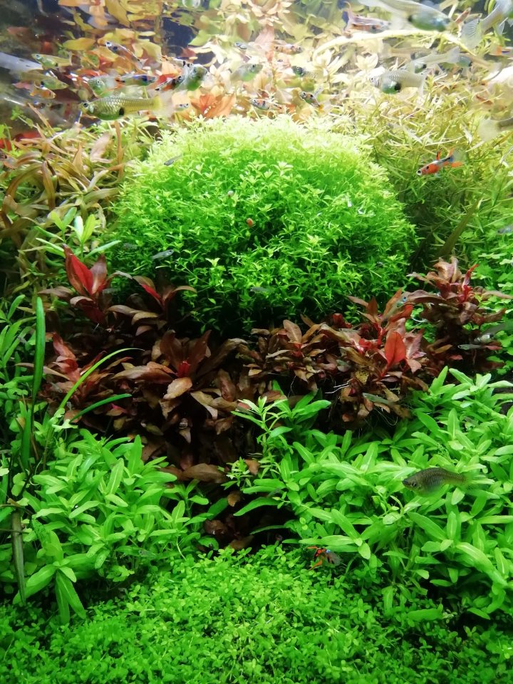 Manutenzione cambio acqua 20 litri ogni 2 settimane, potatura piante 1 volta a settimana , lavaggio delle spugne del filtro interno 1 volta ogni 3 settimane e del filtro esterno 1 volta ogni 2 mesi o quando vedo che si intasa.