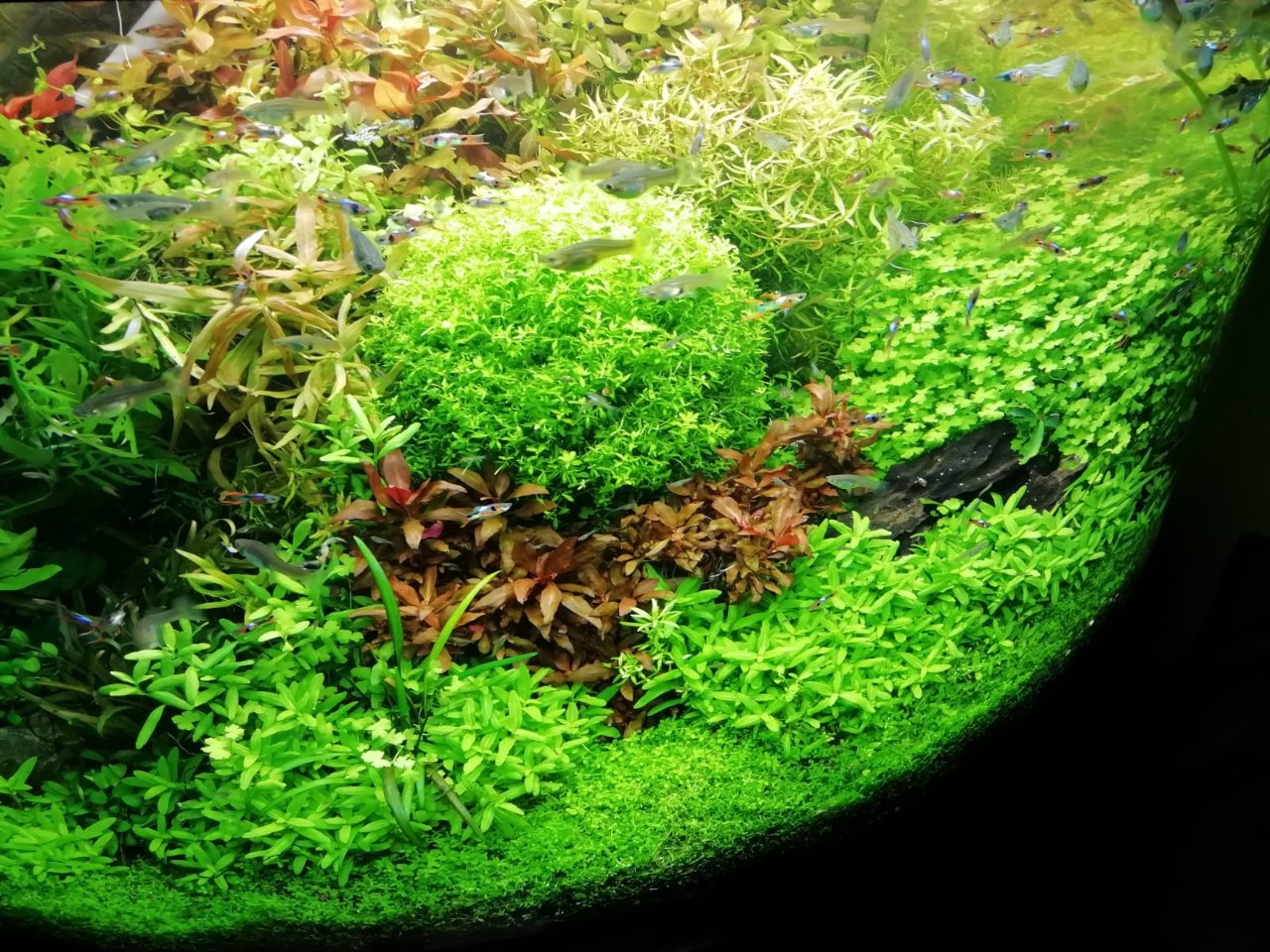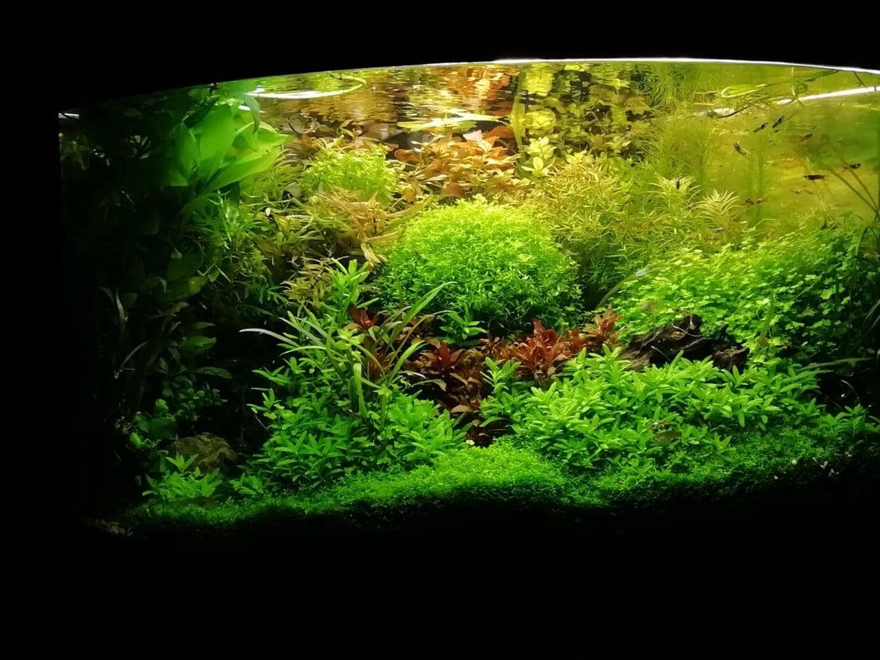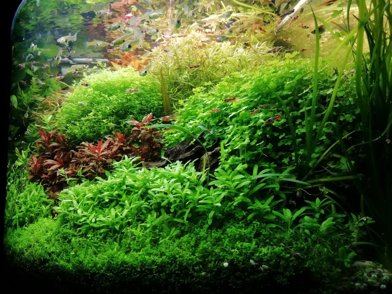 Manutenzione cambio acqua 20 litri ogni 2 settimane, potatura piante 1 volta a settimana , lavaggio delle spugne del filtro interno 1 volta ogni 3 settimane e del filtro esterno 1 volta ogni 2 mesi o quando vedo che si intasa.
