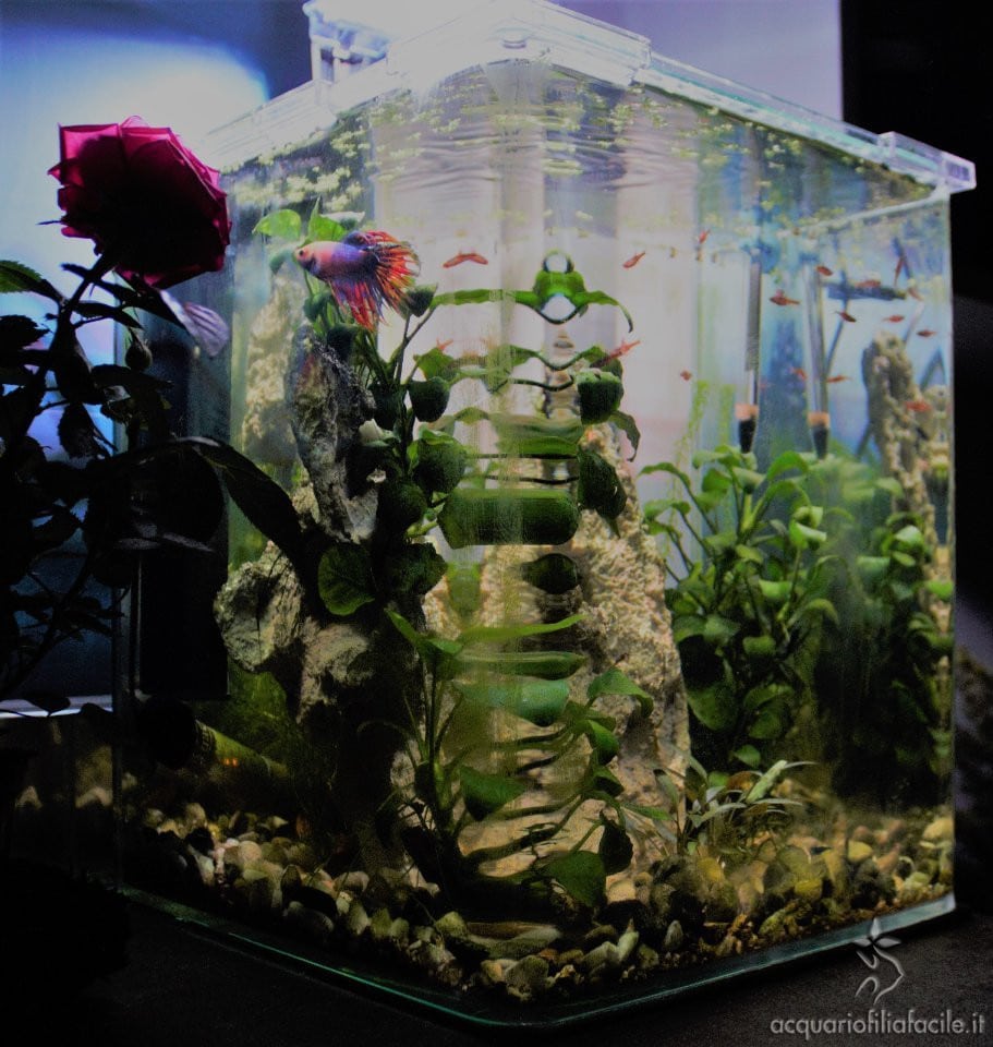 L’acquario ha un piccolissimo filtro interno angolare di serie, un termoforo, un termometro e una plafo di circa 5 watt di serie con LED bianchi, rossi e blu.