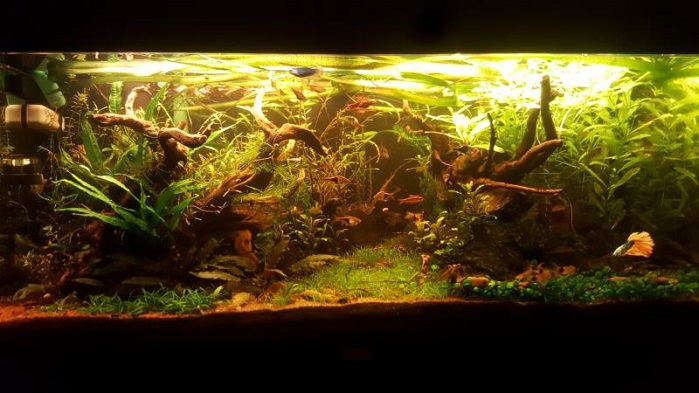 Oltre alle piante, rami, rocce e radici utilizzo anche molte foglie di catappa, che oltre a liberare preziosi tannini che migliorano e mantengono la salute dei pesci, sopratutto dei Betta, e a diventare terreno di coltura per microorganismi di cui si cibano Caridina e piccoli pesci, rendono anche l’acqua di un bel colore ambrato, oltre a stabilizzare il pH.
