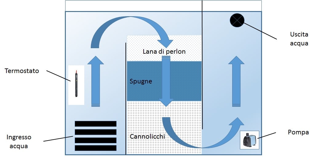- la lana e le spugne devono trovarsi all’inizio del flusso, in modo da intercettare tutte le particelle solide in sospensione prima che arrivino ai cannolicchi. Il loro ordine è sempre molto controverso. La maggioranza preferisce mettere prima la lana poi le spugne, in modo da favorire un maggior insediamento di batteri all’interno delle spugne stesse.
