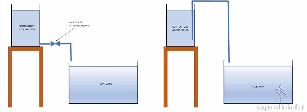 Riempire l’acquario è un’altra operazione che può rivelarsi insidiosa, nonché devastante per la pace familiare. Inoltre, l’idea di tenere sospesa una tanica piena d’acqua sopra l’acquario per tutto il tempo necessario per l’operazione può scoraggiare più d’uno. Bene, ecco una grande rivelazione: non è necessario fare fatica tenendo sospesi la tanica o il secchio durante tutta l’operazione. È sufficiente posizionare la tanica più in alto rispetto all’acquario, infilarci un tubo e il gioco è fatto! Anche per questo caso le immagini sono più esplicative di tante parole.
