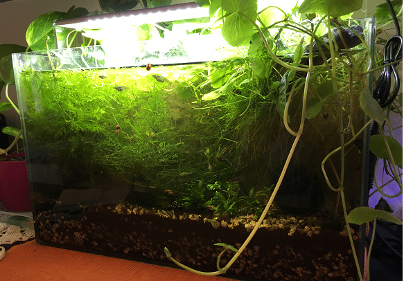 Se non riuscite a vederlo state tranquilli, non state perdendo la vista: il filtro non c’è e l’acquario funziona senza alcun problema da quasi un anno. Questo perché il filtro migliore in assoluto che possiamo utilizzare è… le piante!!!