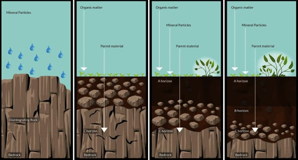Con il tempo, in base al clima a cui la roccia è sottoposta, avremo la formazione di strati (detti orizzonti) superficiali che non saranno più coesi come la roccia madre originale.