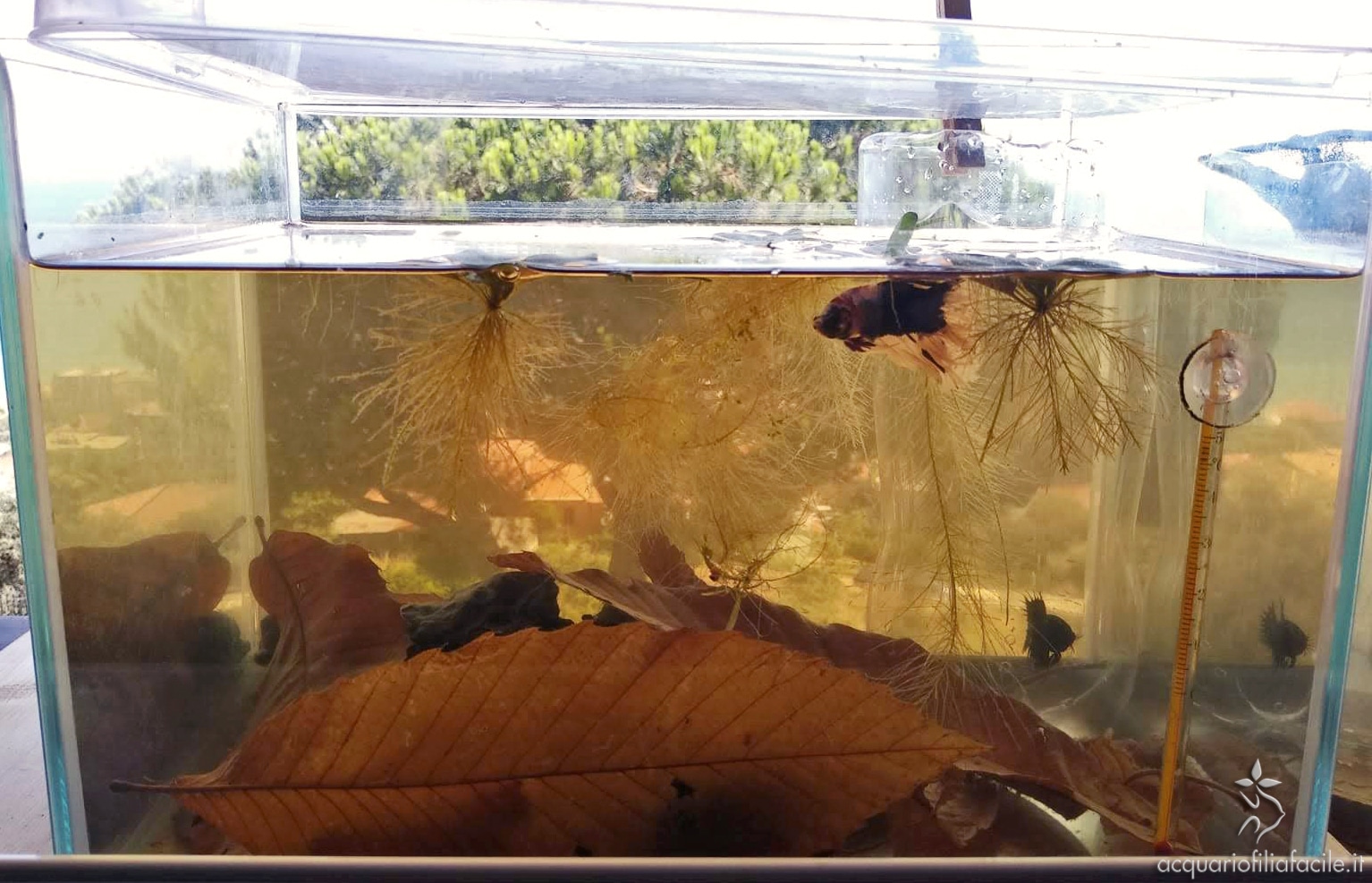 Infine, aggiungeremo in un angolo della vasca una nursery (o un qualsiasi contenitore trasparente con dei forellini) che ospiterà la femmina.