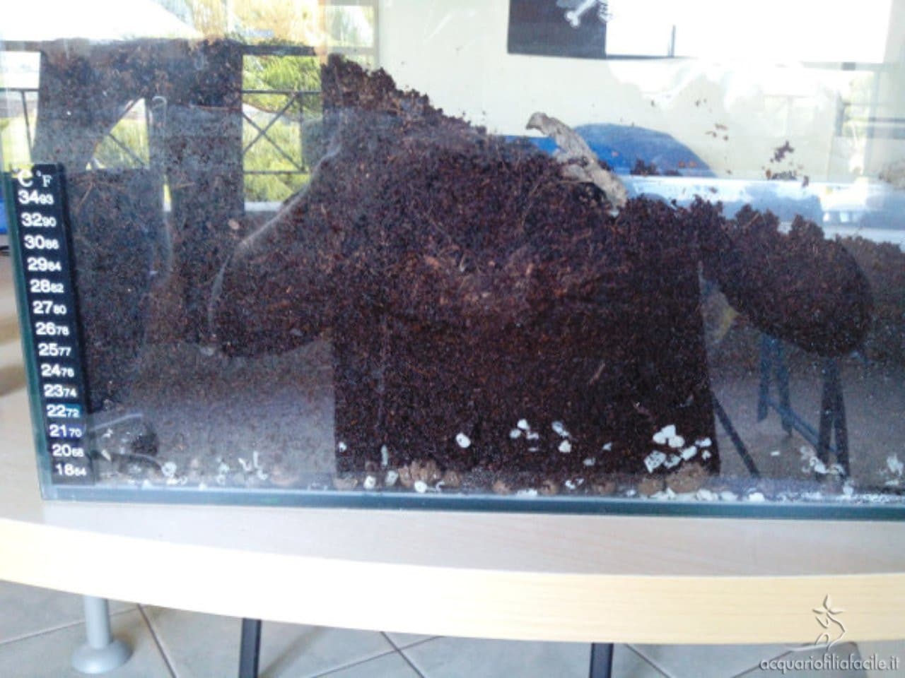 La seconda – da me preferita – è quella di allestire un ambiente totalmente terrestre, posizionando circa 6-7 cm di terriccio biologico o fibra di cocco all’interno della vasca e allestendo molte tane.