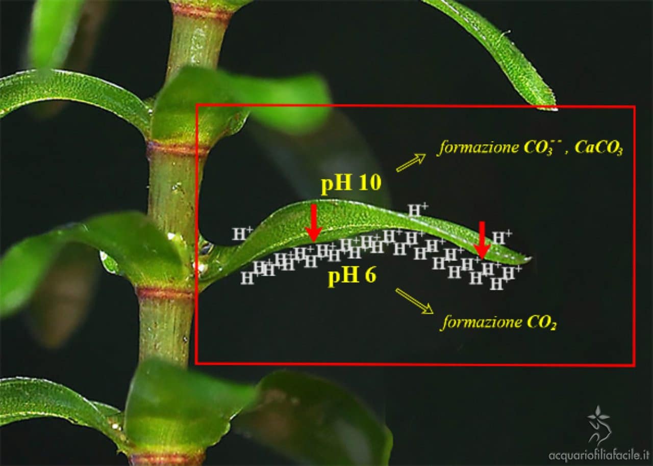 Sulla superficie inferiore della foglia il pH acido indotto dall’accumulo di ioni idrogeno (H+) provoca la formazione di CO2 (e acqua) attraverso la neutralizzazione dei bicarbonati (HCO3–):