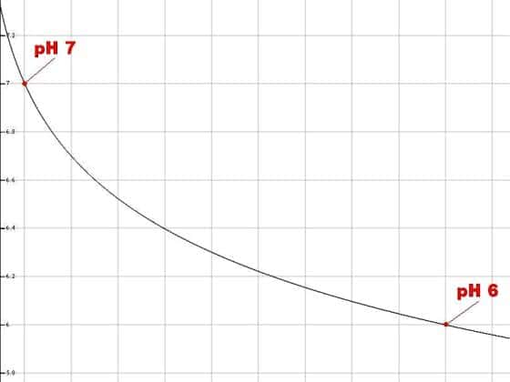 Qui sotto abbiamo una curva logaritmica, che mostra il passaggio da pH 7 a pH 6…