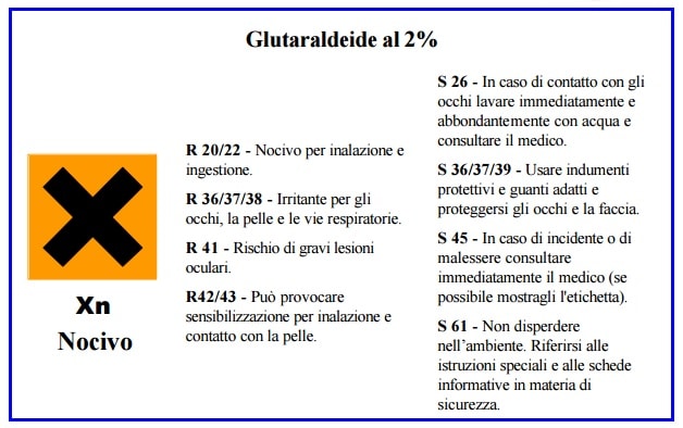 Questa è l’etichetta che accompagna i prodotti a base di glutaraldeide in ambito sanitario: