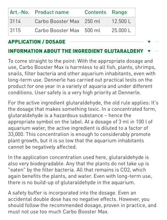 Molti prodotti per acquaristica venduti come «carbonio organico», «carbonio liquido» sono a base di glutaraldeide.