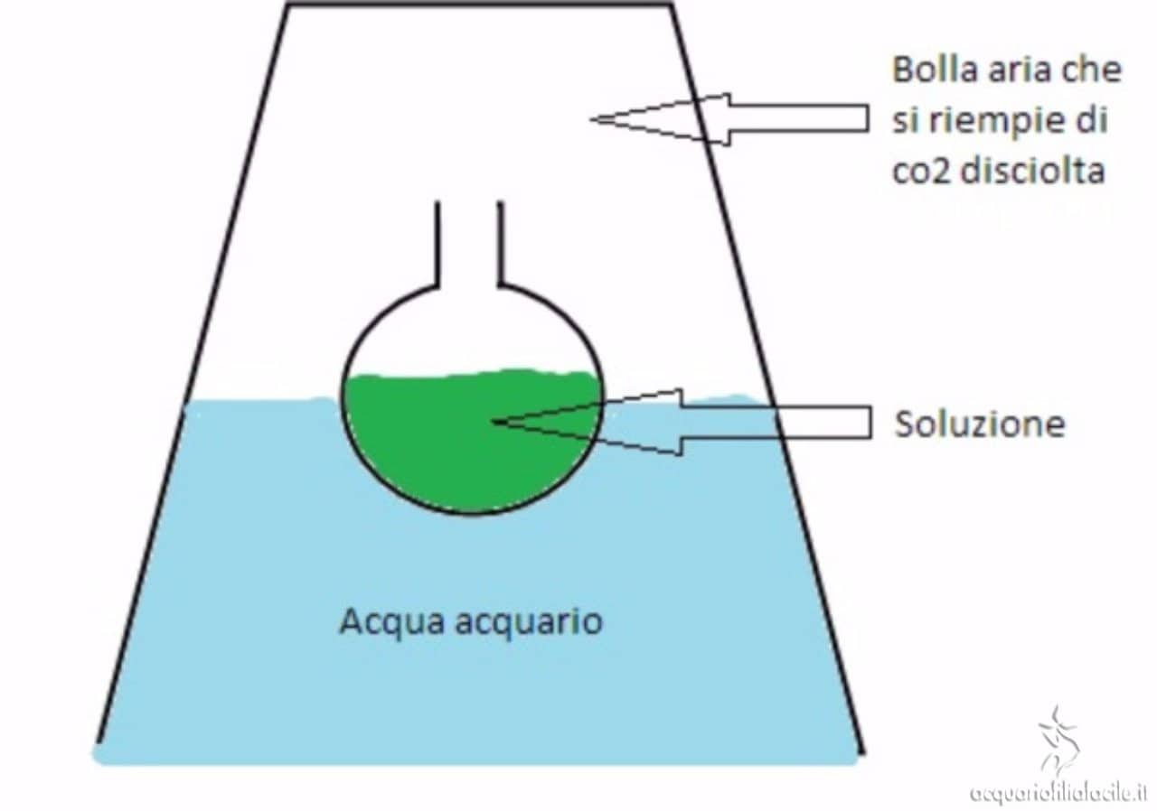 La CO2 contenuta nell’acquario si riversa lentamente in quella bolla d’aria; da lì, altrettanto lentamente, passa al liquido dell’ampollina.