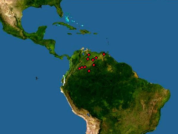 Nella mappa dei ritrovamenti del ramirezi, qui sotto, il Rio Meta è individuabile da quei tre punti rossi affiancati, sulla sinistra.