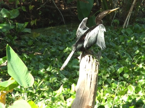 Nell’immagine, oltre all’Anhinga, possiamo vedere anche due piante tipiche del Sudamerica: Echinodorus grandiflorus ed Eichornia crassipes.