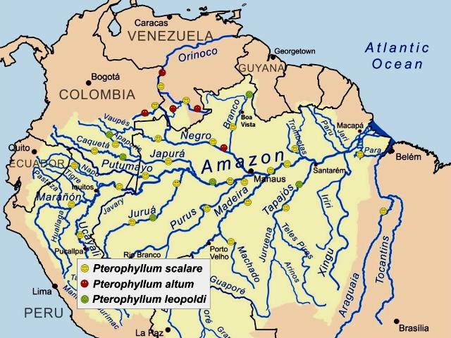 Abbiamo distinto tre specie: Pterophyllum scalare, Pterophyllum altum e Pterophyllum leopoldi, mostrando la loro diffusione nel bacino del Rio delle Amazzoni, limitatamente ai ritrovamenti più significativi.