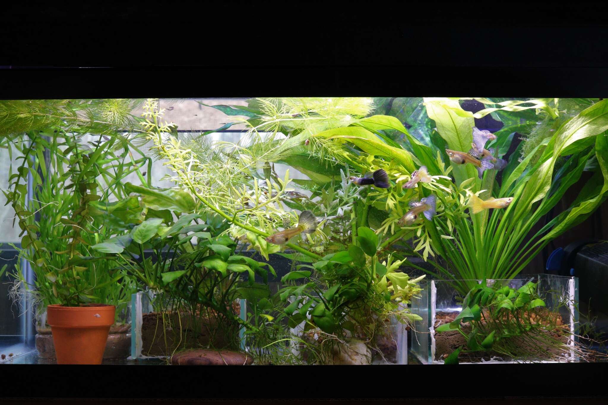 20 gal with Guppies (2018). To catch the fish more easily, I put rooted plants in pots and have a bare glass substrate.