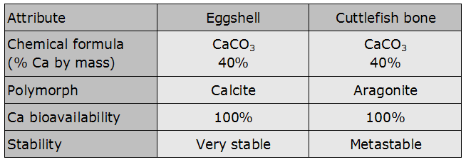 Chemistry teaches that eggshell and cuttlefish bones are both made of Calcium Carbonate. So, why should we prefer the second to the first one?