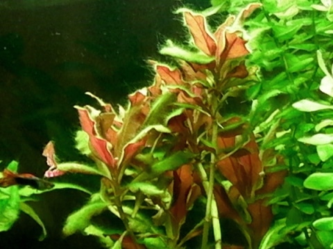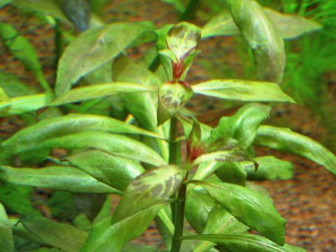 On the species with larger leaves, like Hygrohila corymbosa, the lack of potassium produces holes between the veinings, but always starting from the lower leaves.