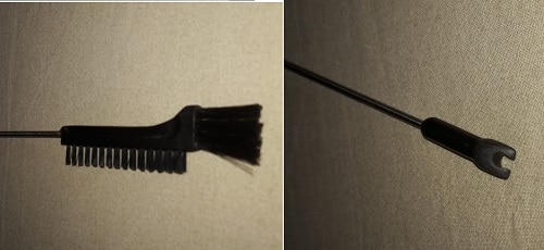 A ciascuna estremità del sondino applicheremo un utensile. Da un lato una spazzolina per pulire o rimuovere oggetti nei punti più difficili, dall’altro una piccola forcella in plastica.