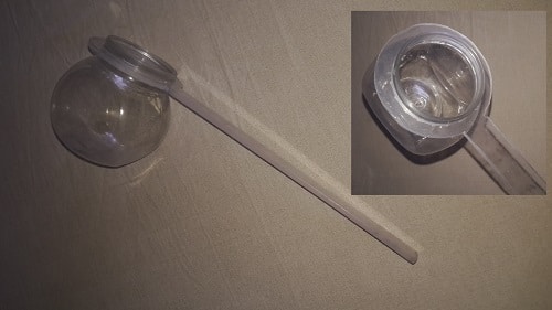 Si tratta di un banale barattolo di plastica a cui ho applicato un manico, ricavato da un pezzo di plexiglass. Dopo aver sagomato il manico correttamente, per unirlo al vasetto, è sufficiente sfruttare il filetto su cui si fissava il tappo del vaso. La tenuta fra i due pezzi, se il manico è ben sagomato, sarà perfetta.