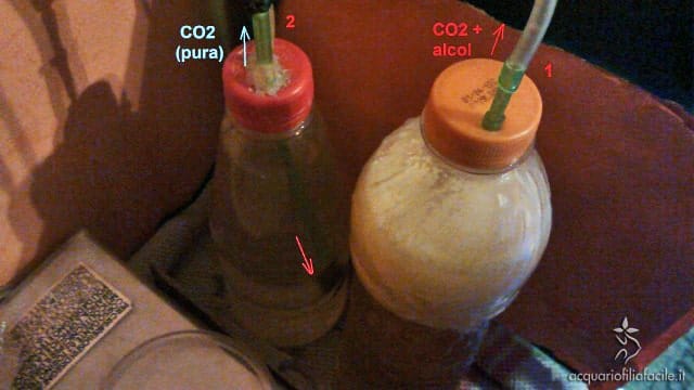 Importante è il passo successivo. Molti non lo ritengono necessario, ma mi permetto di dissentire: quando la CO2 esce, io la faccio passare in un secondo contenitore (ehm, bottiglia) pieno d’acqua. Questo perché con la produzione di CO2 si forma anche dell’alcol (i lieviti, la birra… sarebbe quello il loro utilizzo, non l’acquariofilia); se non frapponessi un contenitore d’acqua, state pur certi che una percentuale di alcol entrerebbe in acquario.