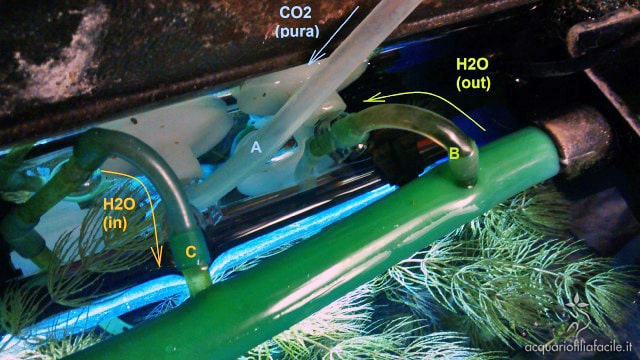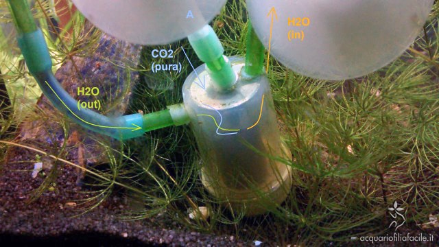 L’acqua arricchita di CO2 esce dal barattolino attraverso il tubicino sul lato opposto del barattolo (H2O in) e si ricongiunge al flusso di mandata del filtro, per essere letteralmente sparata in acquario. Se fosse passata qualche bolla sotto forma gassosa… beh, verrà frammentata dal ricongiungimento dei due flussi.