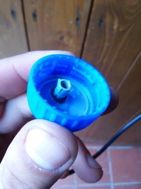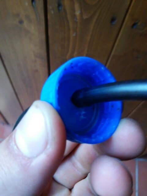 Tagliamo quindi uno spezzone di tubicino, abbastanza lungo da arrivare dal tappo fino al fondo della bottiglia (non serve essere precisi!), e “avvitiamolo” sulla parte di tassello scoperta. Ecco il risultato: