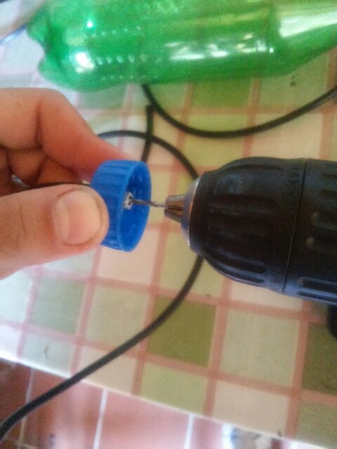 A questo punto, prendiamo un tappo da una delle due bottiglie; poi, con il trapano, facciamo un foro utilizzando la punta da 6 mm.