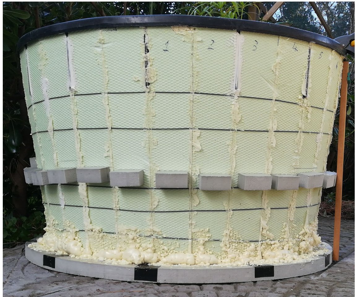 I pezzi di polistirene della base sono stati bloccati con un nastro adesivo rinforzato, mentre le strisce verticali sono state bloccate in posizione con del filo di ferro gommato.