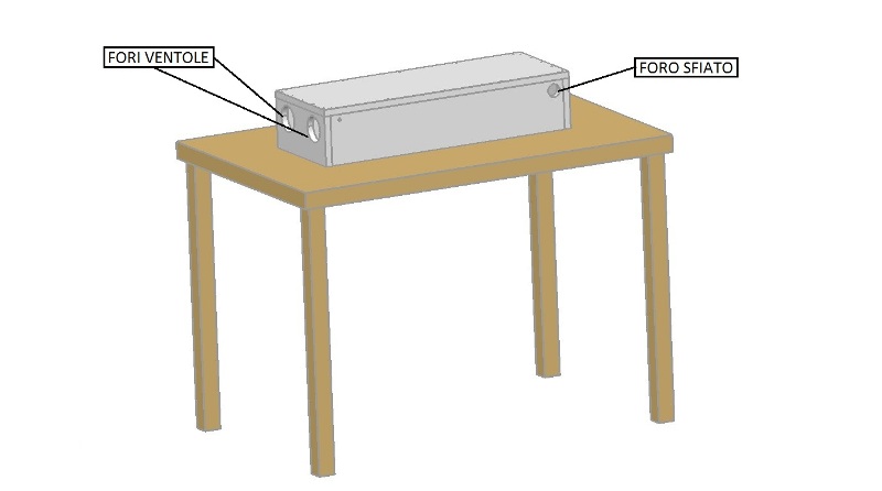 Con la fresa apriremo anche due fori su un lato corto (serviranno per le ventole) e un altro sul lato opposto; questi fori permetteranno il ricircolo dell’aria, in quanto le CFL scaldano parecchio. Essendo una plafoniera in legno, è fondamentale evitare eventuali surriscaldamenti.