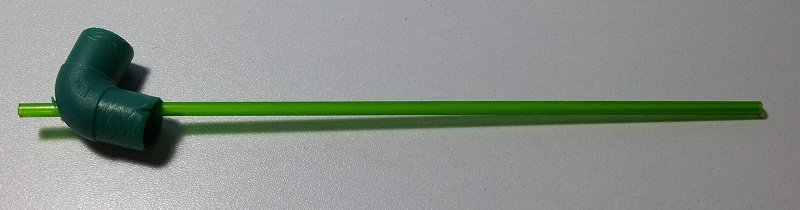 - Prendiamo il terzo gomito e lo foriamo all’estremità con la punta da 2,5 mm; quindi innestiamo la cannuccia.