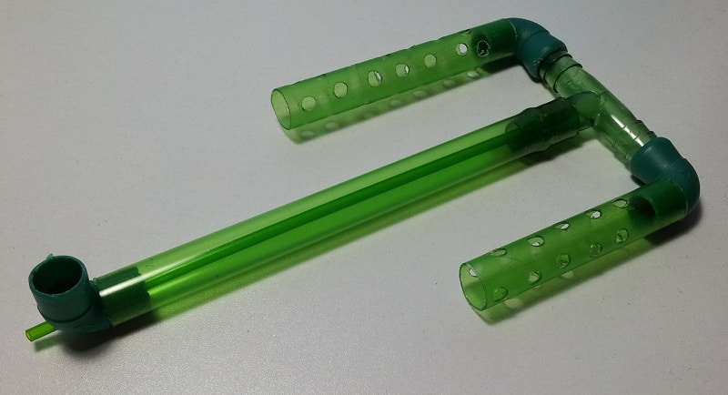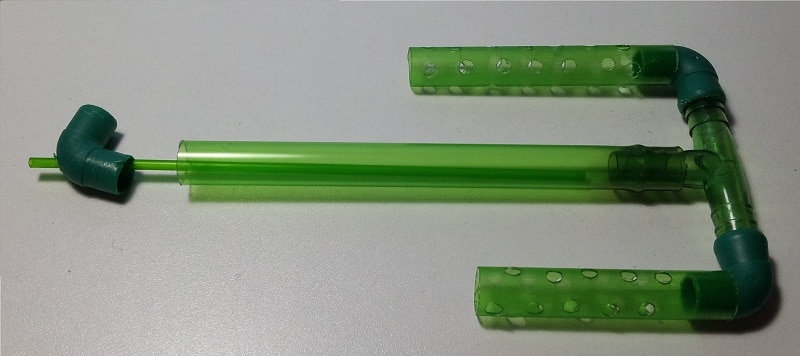 - Colleghiamo quindi il tubicino dell’aereatore all’imboccatura della cannuccia rimasta libera; una volta azionato l’aeratore il nostro filtro ad aria inizierà a gorgogliare filtrando l’acqua.