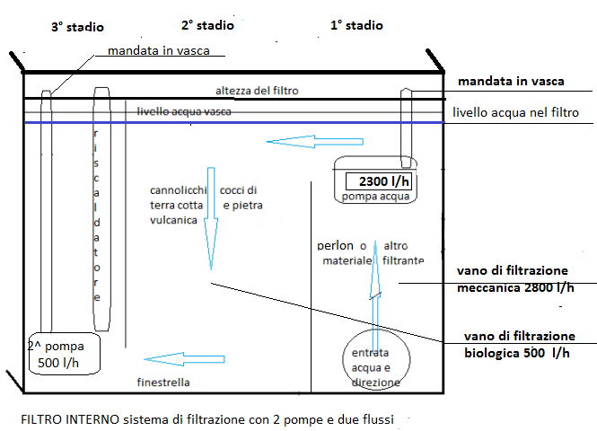 Nel mio filtro, la separazione dei flussi avviene per differenza di altezza tra i vani interni e il resto della vasca.