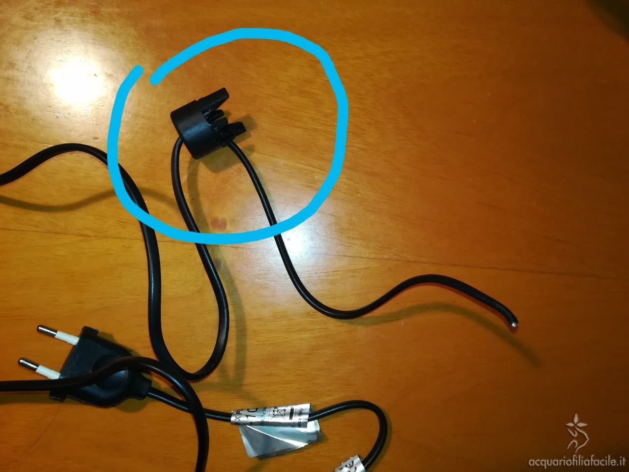 Al posto dell’alimentatore montiamo una spina, rimuovendo la guaina nera all’estremità del filo appena tagliato e spellando le punte dei due fili con una forbice (facendo attenzione a non tagliare anche i fili di rame).