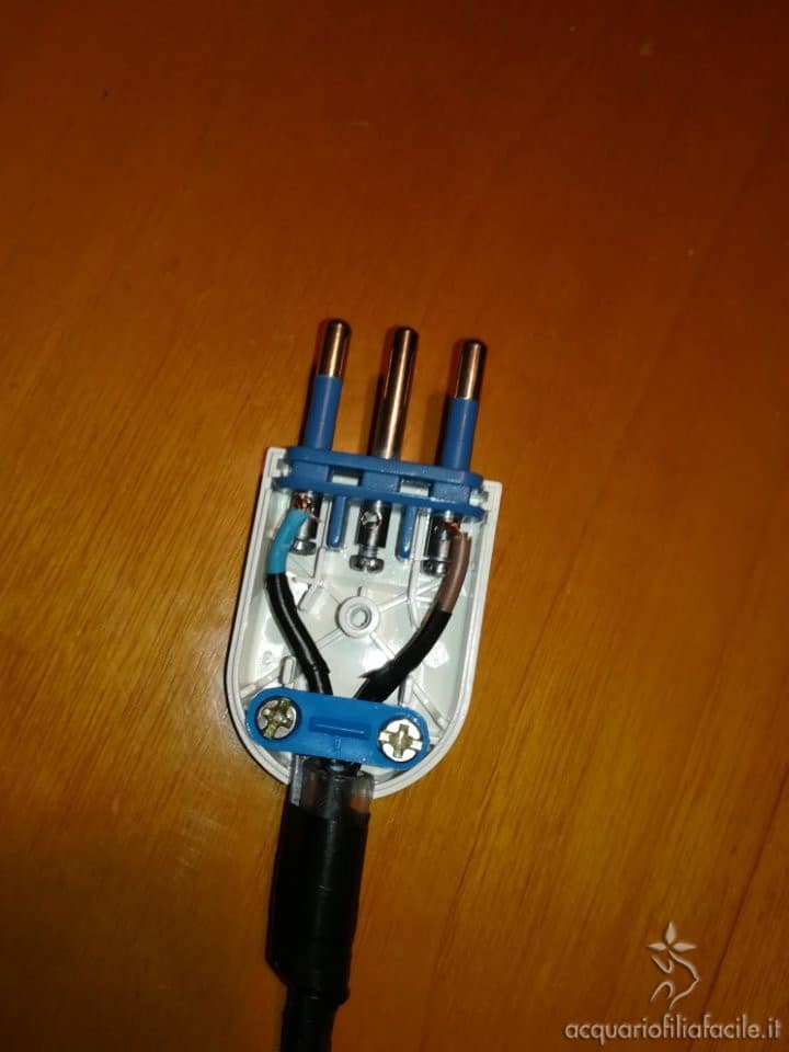 Attacchiamo i due fili alla spina stringendo le estremità nelle viti presenti. Nel caso aveste una spina con tre denti, non utilizzate quello al centro (la messa a terra).
