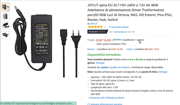 Quello che ho scelto è da 12 V per 8 A; arriva quindi fino a 96 W.