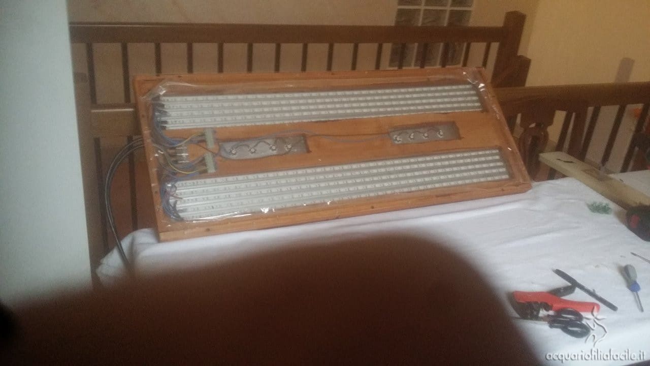 Ho avvitato sia le barre che i dissipatori alla tavola di legno, come le avevo posizionate all’inizio, con viti da 16mm da legno. Quindi ho collegato una strip da 6400K e una da 4500K in parallelo ad ogni canale; al canale centrale ho collegato una strip da 6400, una da 4500 e il gruppo da 8 LED grow, tutto in parallelo.