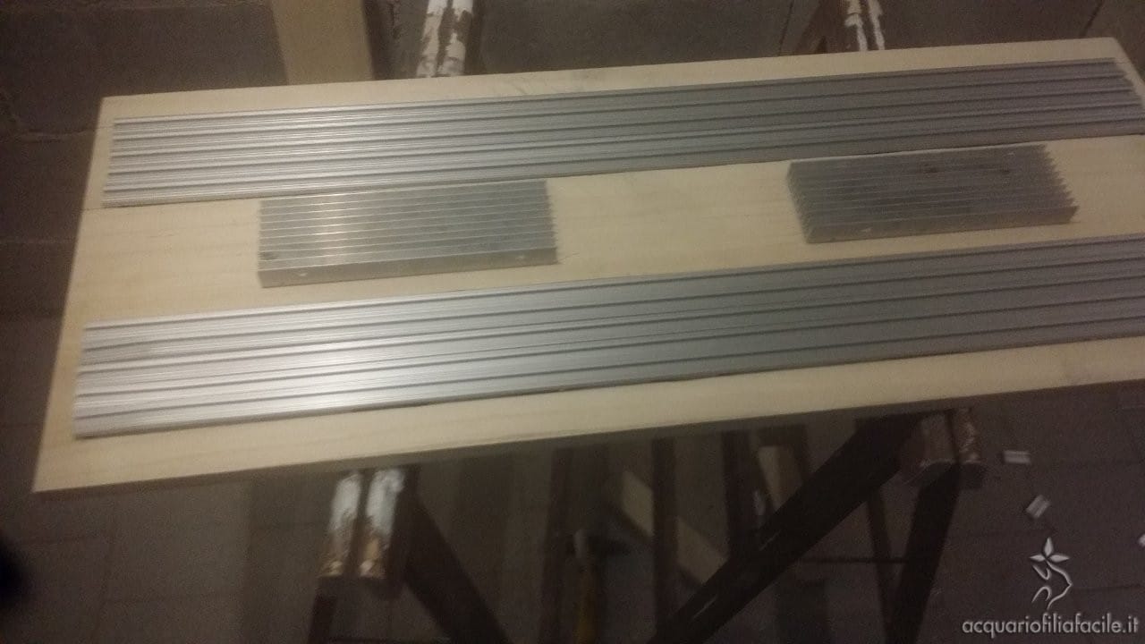Al centro della tavola metterò due dissipatori (che avevo già), quindi avrò: 5 barre; poi i due dissipatori centrali ai quali applicherò i LED grow light; infine altre 5 barre.
