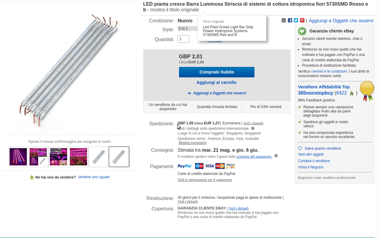 - 4 barre da 50 cm idroponiche (5 LED rossi ogni 1 blu) = 13 euro;