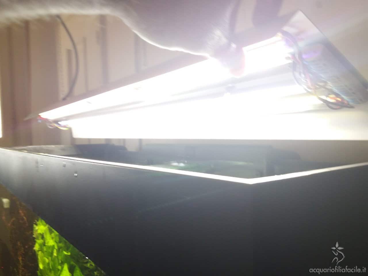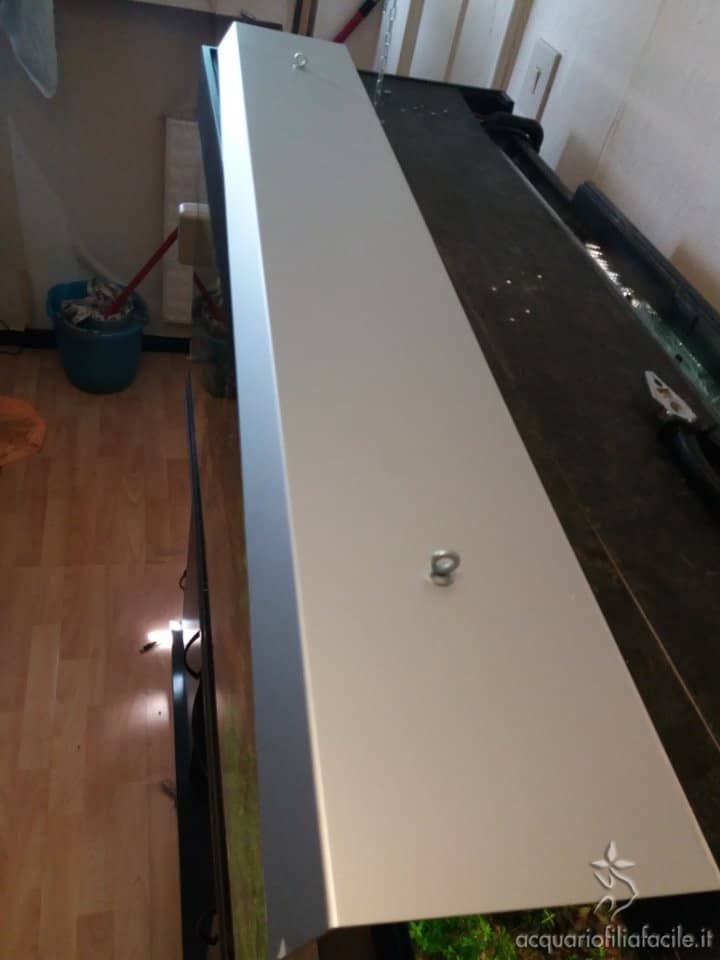 La soluzione con le catenelle è splendida: quando dovrò lavorare nell’acquario mi basterà semplicemente alzare la plafoniera più in alto per avere tutto lo spazio necessario.