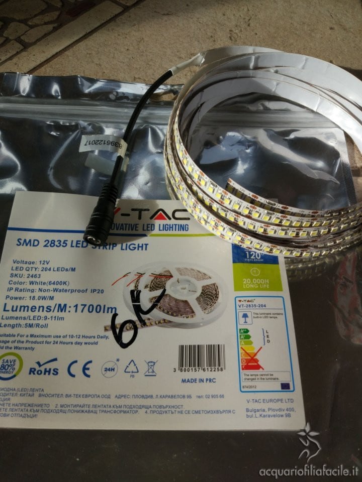 - 2 metri di strip LED SMD 2835, 1700 lumen/metro, 18 w/metro. Ho optato per le più forti che ho trovato. Si acquistano in bobine da 5 metri. Costo: 15€ dai cinesi.