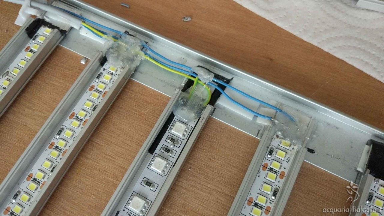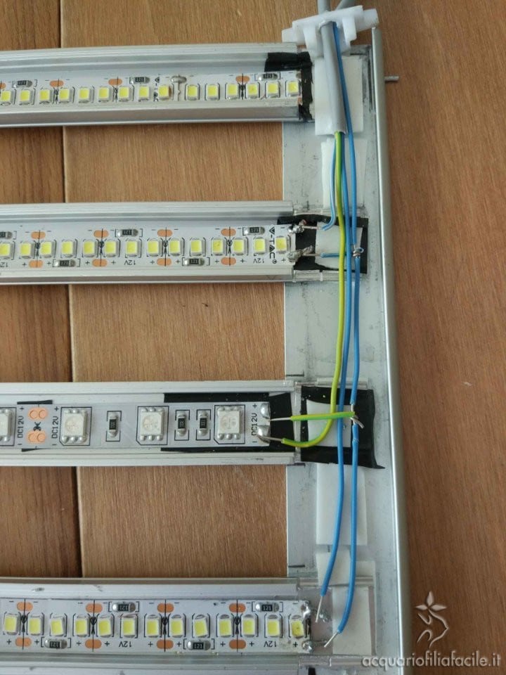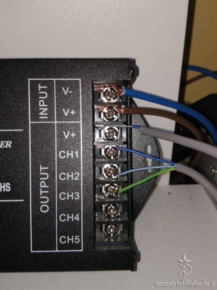 Come si vede, c’è il filo singolo collegato al polo positivo e il cavo a tre fili che collega i tre canali (due bianchi, altri due bianchi e un Grow).