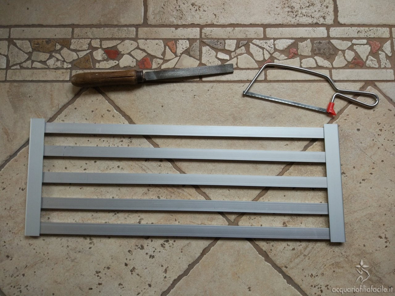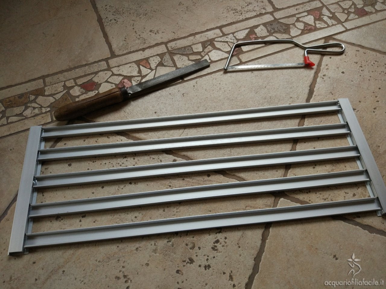 Ho tagliato due profili di alluminio con il lato tondeggiante della lunghezza di 20 cm; le cinque canaline (e le relative coperture trasparenti) della lunghezza di 50 cm.