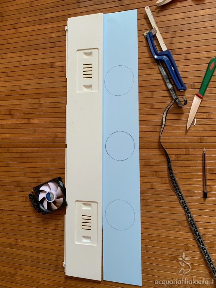 A questo punto, ho tracciato sul pvc tre sagome circolari equidistanti fra loro (partendo dal centro) del diametro delle ventole (nel mio caso 9 cm).