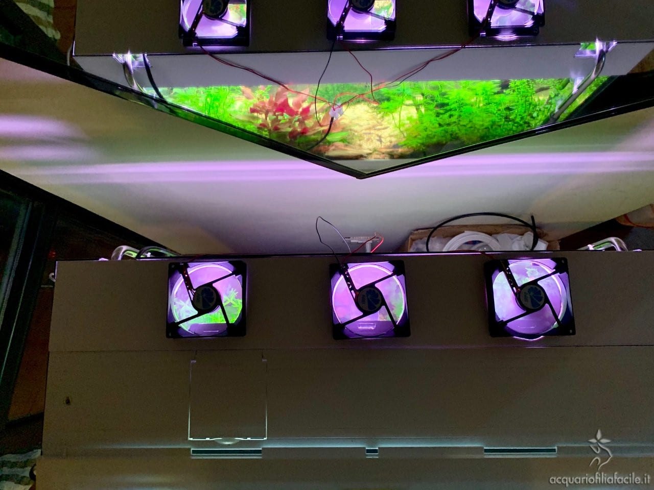 Le ventole sono state montate in aspirazione: aspirano l’aria calda dall’interno dell’acquario soffiandola all’esterno.