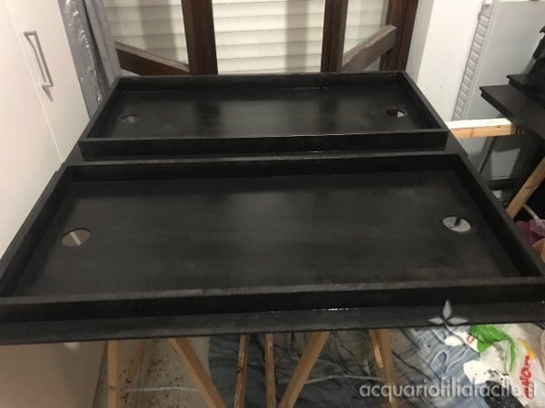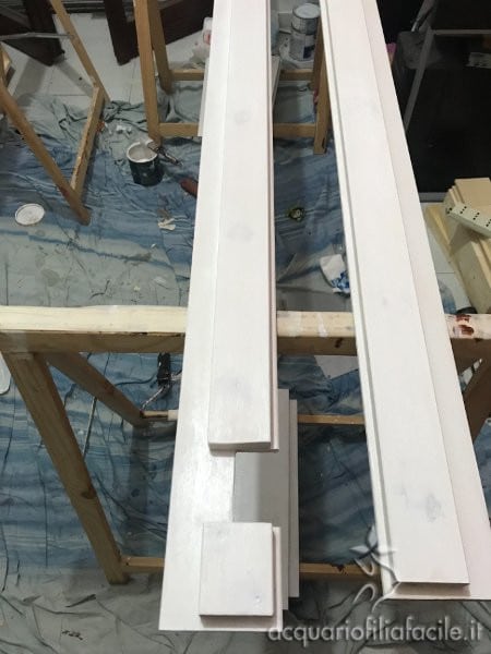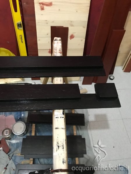 Già che c’ero, ho realizzato anche un telaietto in legno per la parte inferiore della vasca, dello stesso colore del coperchio. Per proteggere il legno ho passato fondo per legno, vernice per legno da esterno, due mani di fondo turapori e quattro mani di vetrificatore da parquet… dovrebbe tenere bene l’umidità. Volendo si può usare il Plastivel al posto del vetrificatore.