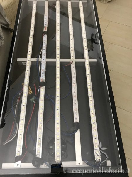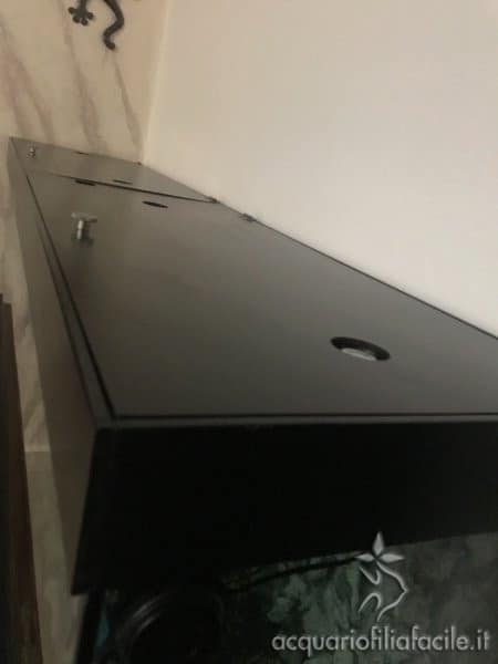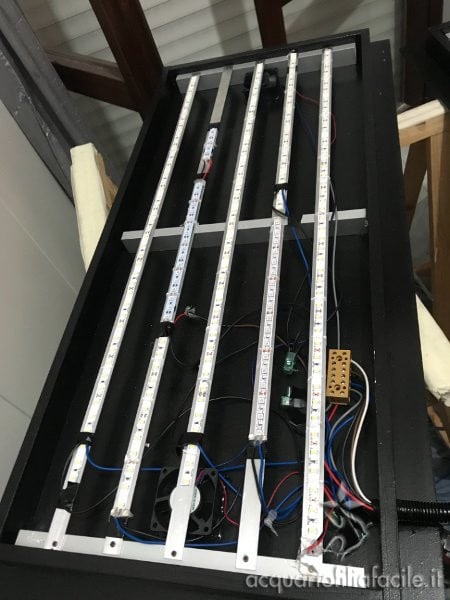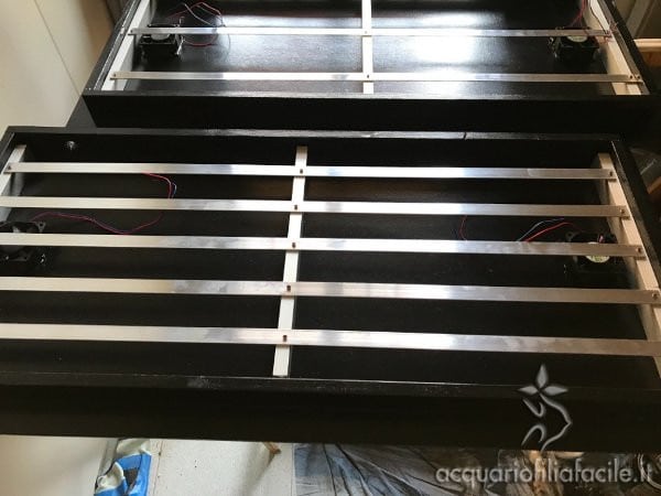 Ho incollato i listelli da 60 mm su quelli da 10 cm, lasciando 33 mm di sporgenza; in questo modo ho creato l’appoggio del coperchio sul vetro e la battuta della plafoniera apribile. Dopodiché ho verniciato il tutto. Ho realizzato quindi due coperchi/plafoniere da 94 cm, in modo che si possano aprire indipendentemente l’uno dall’altro. Ho tagliato due pannelli in MDF spessi 6 mm nella misura 94×44,5 cm; due listelli di spessore 15 mm, alti 40 mm, nella misura 88x35cm; e una lastra di plexiglass da 88×38 cm. Su uno dei pezzi da 88 cm ho praticato un foro da 16 mm e vi ho incollato (con silicone neutro nero) un metro di tubo corrugato nel quale passeranno i cavi di alimentazione dei LED. Con il Vinavil e qualche vite ho applicato i listelli in squadra; ho aperto due fori di 60 mm di diametro: serviranno per le ventole di raffreddamento; infine ho aver verniciato anche questa parte del coperchio.