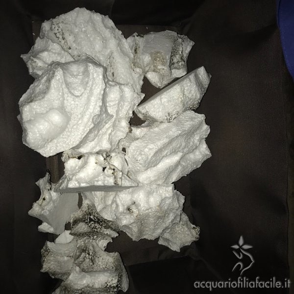 Prendete dei pezzi di polistirolo di varie misure e spessori e iniziate a bruciarli con un accendino o con la pistola termica (io preferisco l’accendino).