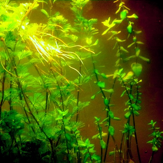 - La Cabomba (a sinistra) ha sviluppato numerose radici avventizie; inoltre fa internodi lunghissimi, anche sulle parti più esposte alla luce.