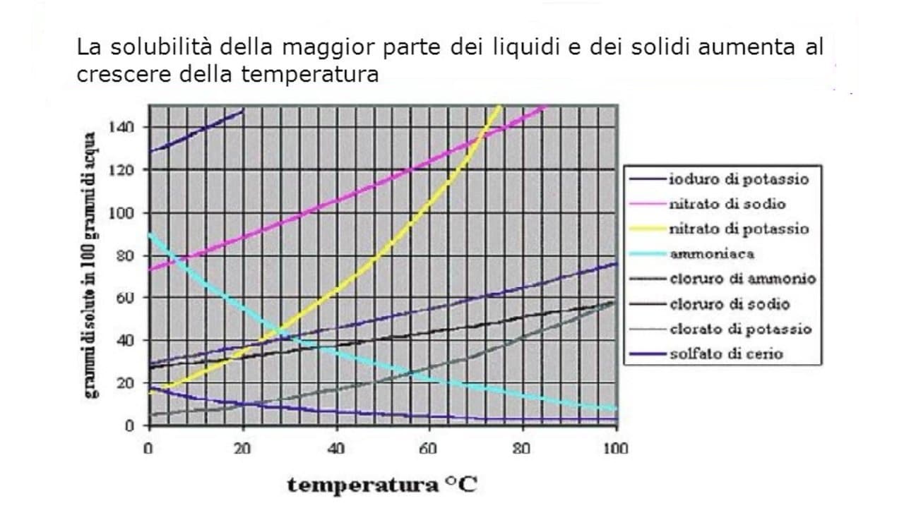 La solubilità aumenta con la temperatura; nei casi in cui restasse una parte indisciolta si può scaldare la soluzione per fare sciogliere il sale rimanente.