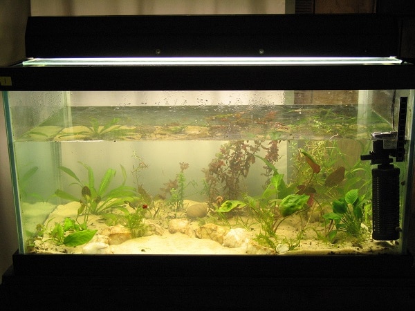 Vasca da 190 litri allestita nel 2008. Per il fondo ho usato 19 litri di terriccio per orto biologico mescolato con 2/3 di tazza di farina d’ossa (fertilizzante organico ricco di fosfati). Oltre a questo, ho aggiunto 3 tazze di terra argillosa per fornire ferro. Dopo 3-4 settimane dall’avvio i pesci hanno cominciato a mostrare sofferenza. Come risposta ho fatto dei grandi cambi d’acqua del’80% ogni 2 settimane per le successive 6 settimane e ho messo dei carboni attivi nuovi nel filtro [il problema erano gli olii inibitori (allelochimici?) rilasciati dalla materia legnosa del terreno]. Ho descritto l’allestimeno in modo più approfondito in un articolo del 2009 su «The Aquatic Gardener» (volume 21, numero 4).